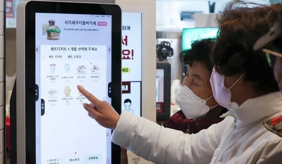 복지시설 내 키오스크 앞에서 어르신들이 직접 사용법을 배우고 있다. 연합뉴스 |