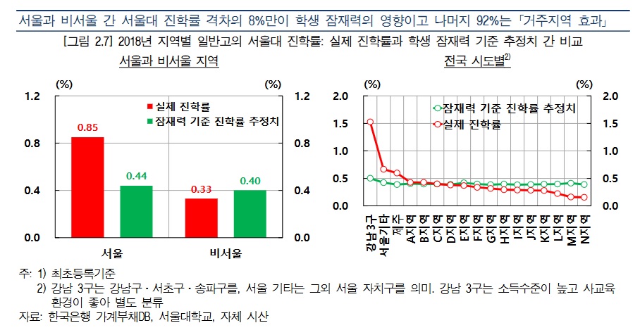 그 결과 미국의 아이비플러스 대학 (미국의 최상위 대학 그룹)에서 상위 1% 부모를 둔 학생의 비율은 하위 50% 가정 출신보다 수십 배 높습니다. 한국도 부모 경제력, 거주지 등 사회경제적 배경이 대학입시에 큰 영향을 미친다는 결과들이 속속 나오고 있습니다. 지난해 한국은행이 발표한 ‘입시경쟁 과열로 인한 사회문제와 대응방안’ 보고서에 따르면 “현재 한국에서는 가난하지만 잠재력이 높은 지방 학생보다, 평범하지만 부유한 서울 학생이 좋은 대학에 입학할 기회를 더 많이 가진다”고 분석했습니다.