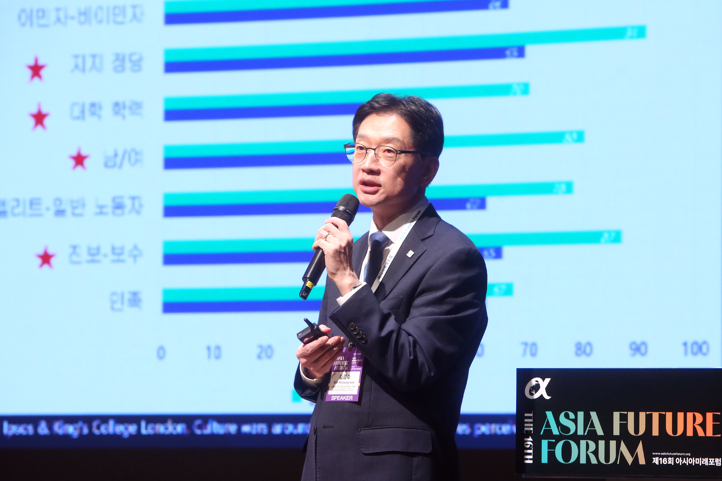 제16회 아시아미래포럼 지역민주주의 특별세션에 참석한 연사들이 함께 토론하고 있다. 사진 왼쪽부터 좌장 서복경 더가능연구소 대표, 김경수 지방시대위원회 위원장, 민 뢰샹 루뱅가톨릭대 교수 |